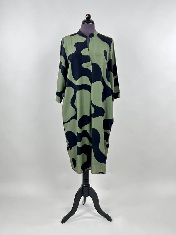 Een hele toffe jurk super mooie print in donkergrien met zwart mooie halslijn met ipstaand boordje. In voor en achterpand een plooi. Rechtvallend midi midel met in de zijnaden gijne zakken. 100% viscose